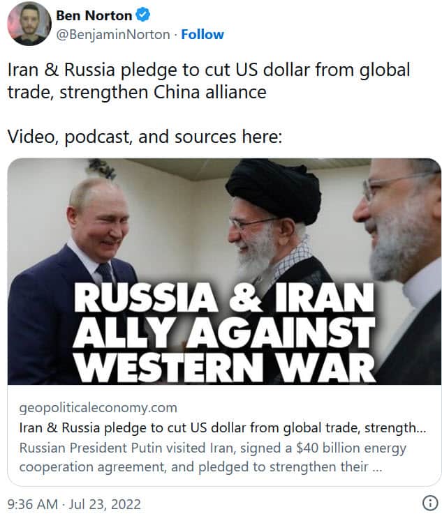 [Click image to read "Iran & Russia pledge to cut US dollar from global trade, strengthen China alliance"]