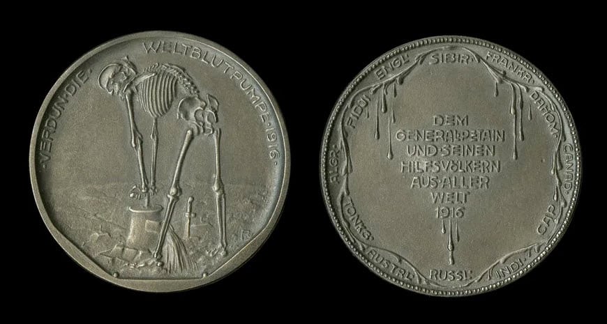 The Battle of Verdun was conceived by the German high command as a way to cripple the French army by drawing them into a preconfigured meatgrinder. The notion was to attack and seize crucial defensive high ground - ground so important that France would be forced to counterattack and attempt to recapture it. The Germans hoped that France would commit their strategic reserves to this counterattack so that they could be destroyed. While Verdun failed to completely sap French combat power, it did become one of the most bloody battles in world history. A German coin commemorating the battle depicted a skeleton pumping blood out of the earth - a chilling but apt visual metaphor.