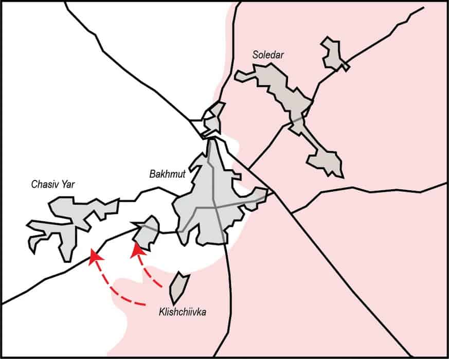 At the present moment, Ukraine’s position around Bakhmut has badly deteriorated, with Russian forces (largely Wagner infantry supported by Russian army artillery) making substantial progress on both of the city’s flanks. On the northern flank, the capture of Soledar pushed Russian lines to within spitting distance of the north-south highways, while the near simultaneous capture of Klishchiivka on the southern flank has propelled the frontlines to the footstep of Chasiv Yar (firmly in Bakhmut’s operational rear).