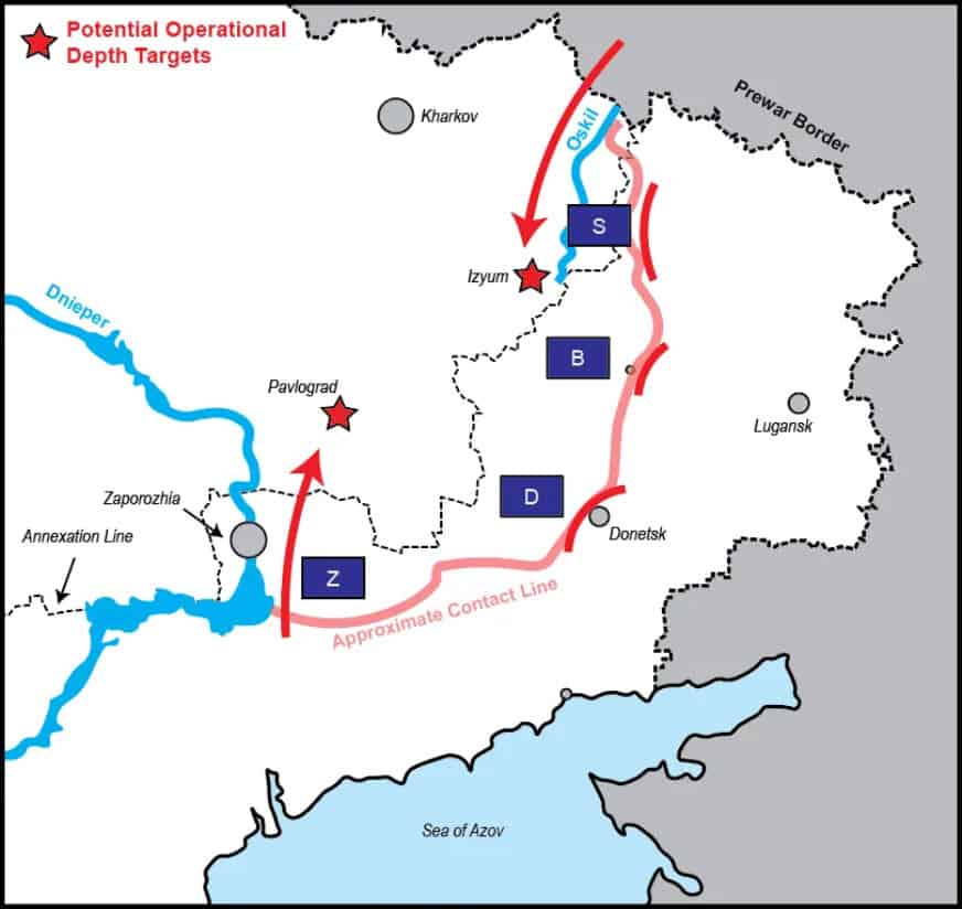 Two operational depth objectives in particular have the potential to shatter Ukrainian logistics and sustainment. These are, respectively, Izyum in the north and Pavlograd in the South. A Russian thrust down the west bank of the Oskil river towards Izyum would simultaneously threaten to cut off and destroy the Ukrainian grouping on the Svatove axis (S on the map) and sever the vital M03 highway from Kharkov. Reaching Pavlograd, on the other hand, would completely isolate the Ukrainian forces around Donetsk and sever much of Ukraine’s transit across the Dneiper.